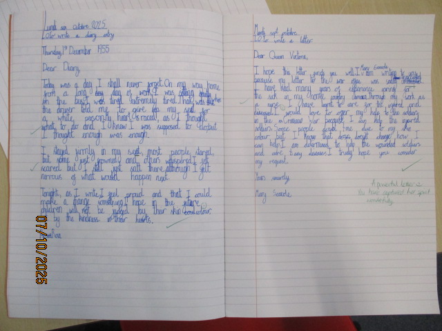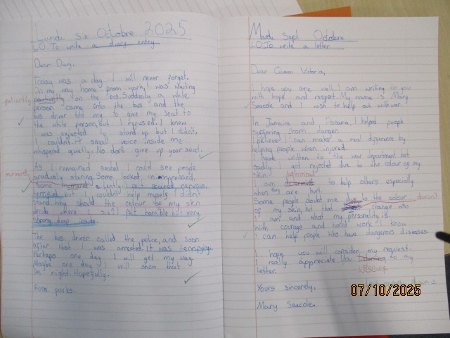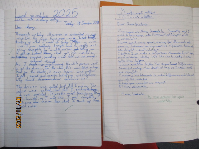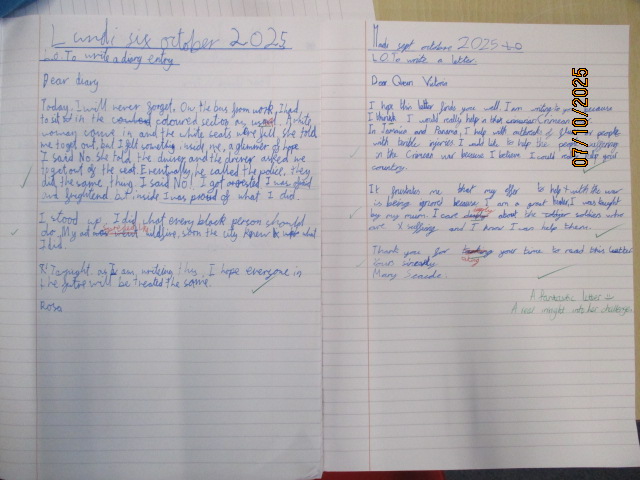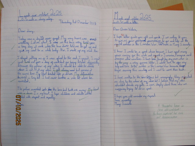 This week, in English, the Year 4 children wrote and edited engaging newspaper reports based on their class book Oranges in No Man’s Land, a powerful story that reflects courage, compassion and resilience during times of conflict. The Year 5 children wrote a diary entry in role as Rosa Parks and a letter to the Queen in role as Mary Seacole, linking their work to Black History Month. The children explored how both women showed courage and determination in the face of injustice. Both writing pieces reflected themes of courage, fairness, resilience and equality, linking to the children’s learning about the rights to be treated without discrimination (Article 2), to have their voices heard (Article 12), to receive an education that promotes respect and understanding (Article 29) and to take pride in their cultural heritage (Article 30).