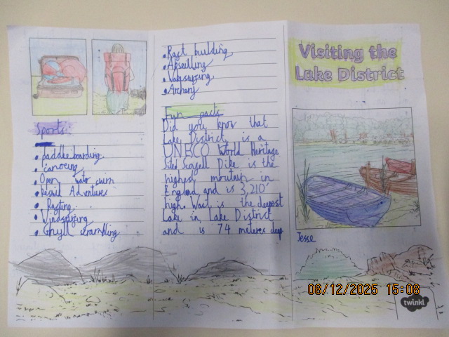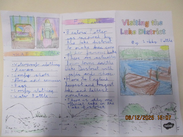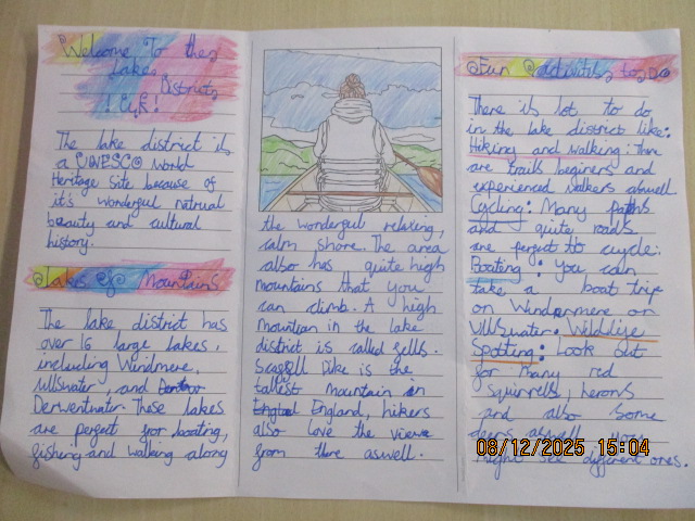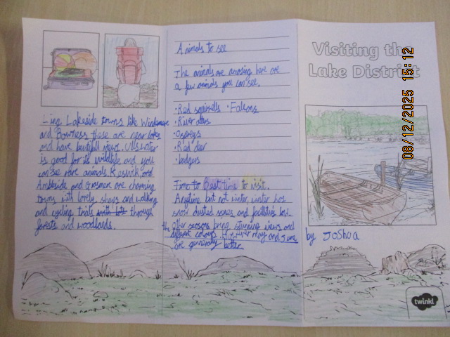 In Geography, the children described the Lake District and explored how the landscape is used by people who work and visit there. They shared their ideas using mind maps. Working with their learning partners, they then researched key facts and created engaging, colourful leaflets about the Lake District. Their leaflets included useful information, interesting facts and a variety of activities for visitors to enjoy.