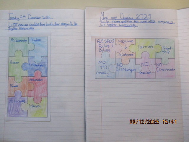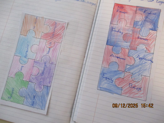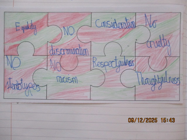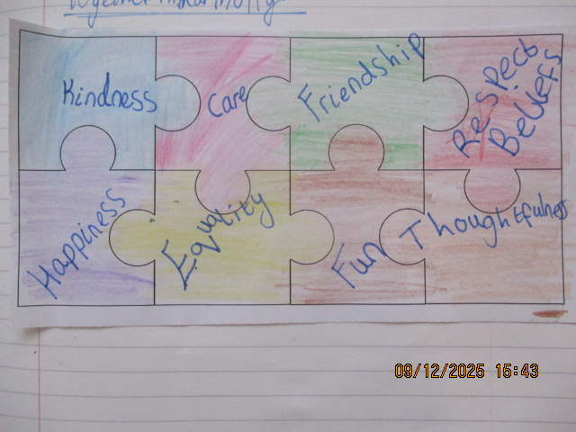 In PSHE, the children identified and described the different groups that make up their school, their wider community and other parts of the UK. They discussed the benefits of living in a diverse society and explained why mutual respect for different faiths and beliefs is important, as well as how we demonstrate this in our daily lives. Linking this to our work as a Rights Respecting School, the children recognised that showing respect and valuing diversity helps uphold Article 2 of the UNCRC—the right of every child to be treated fairly and without discrimination. Together, they created a list of qualities that allow people to live together harmoniously, such as respect, tolerance, understanding, kindness, acceptance, thoughtfulness, caring, consideration and helpfulness.