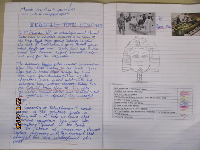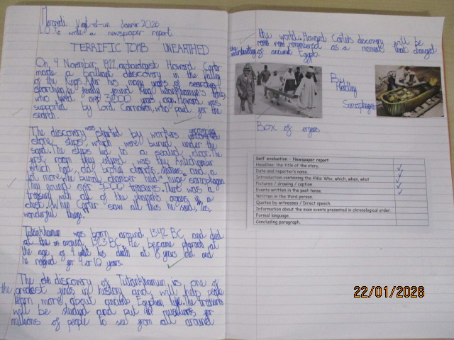 This learning linked closely with English. Year 5 children wrote newspaper articles from the perspective of a journalist in 1922, retelling the key events of the discovery and including correctly punctuated quotes. Year 4 children focused on descriptive writing, producing detailed paragraphs for a letter inspired by a class text.