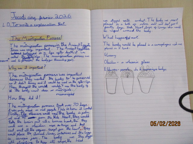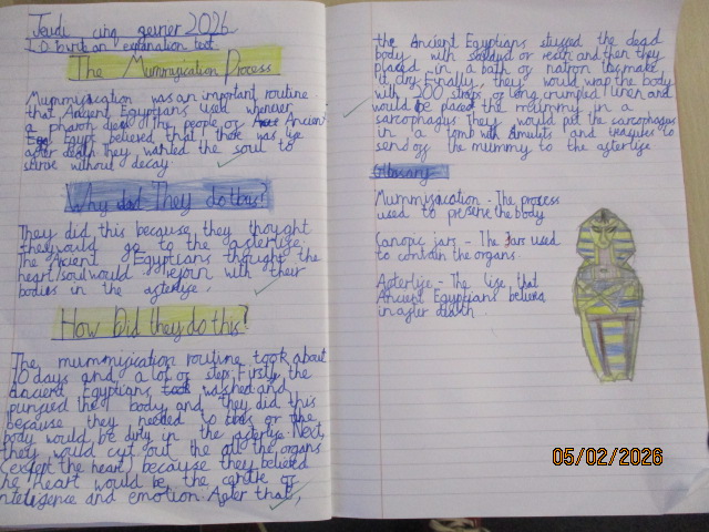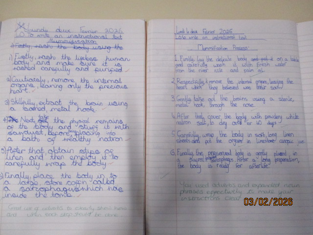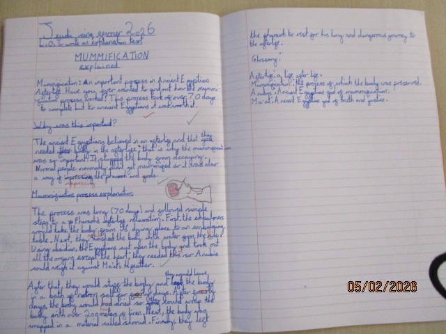 In Maple class this week, linking with their History topic, the children learned about and explained the Ancient Egyptian ritual of mummification, using subject-specific vocabulary to clearly describe each stage of the process. They then wrote a set of instructions and an explanation text about the mummification process, identifying the similarities and differences between the texts and revisiting fronted adverbials and expanded noun phrases to improve the clarity and detail of their writing.