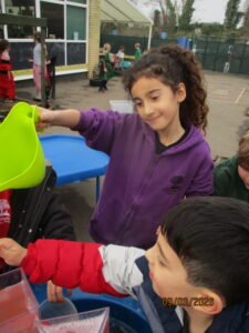 The children also worked on a garden layout activity, where they had to calculate the area using cones, string, and metre sticks. This hands-on task helped them understand how area is measured and gave them the opportunity to practice these skills in a practical way. Another exciting project was scaling a recipe for a royal banquet to serve 20 guests. They measured ingredients with jugs and spoons to learn how to adjust quantities for larger groups.