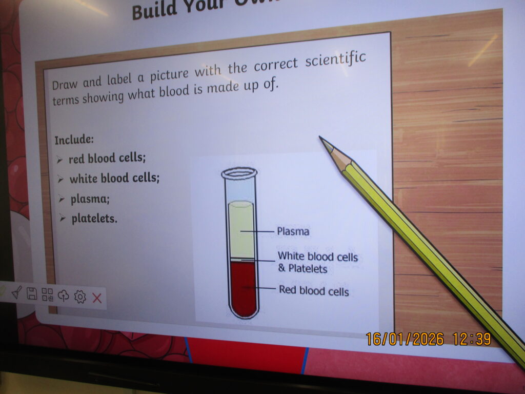 In Science, we rolled up our sleeves (figuratively!) and explored the fascinating world of blood. We learnt about its different components—red blood cells, white blood cells, platelets and plasma—and discussed the important jobs each one does to keep our bodies healthy and protected. There were lots of great questions and some impressive scientific vocabulary being used!