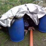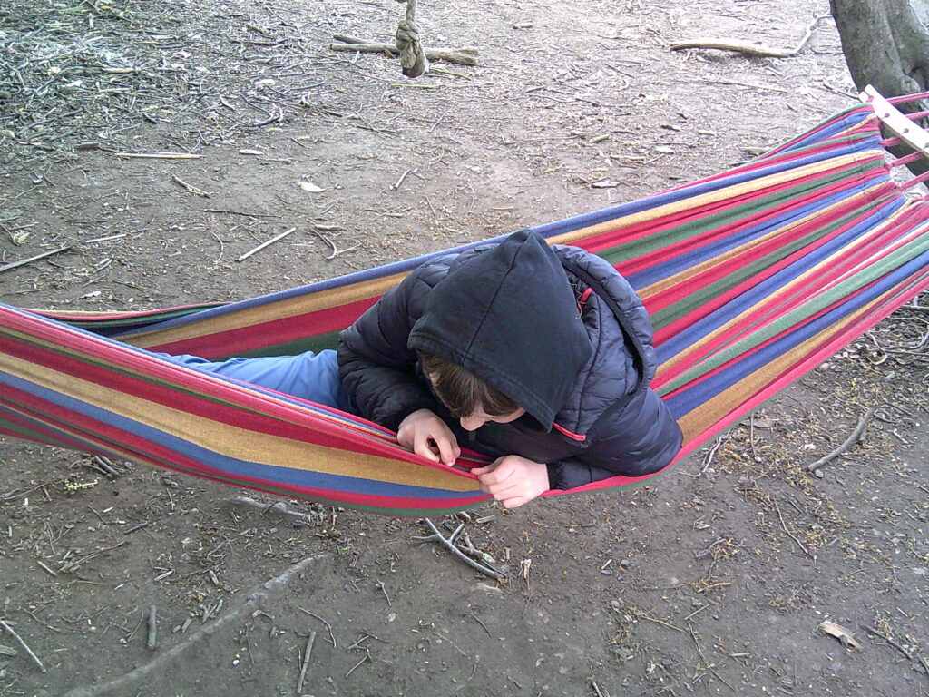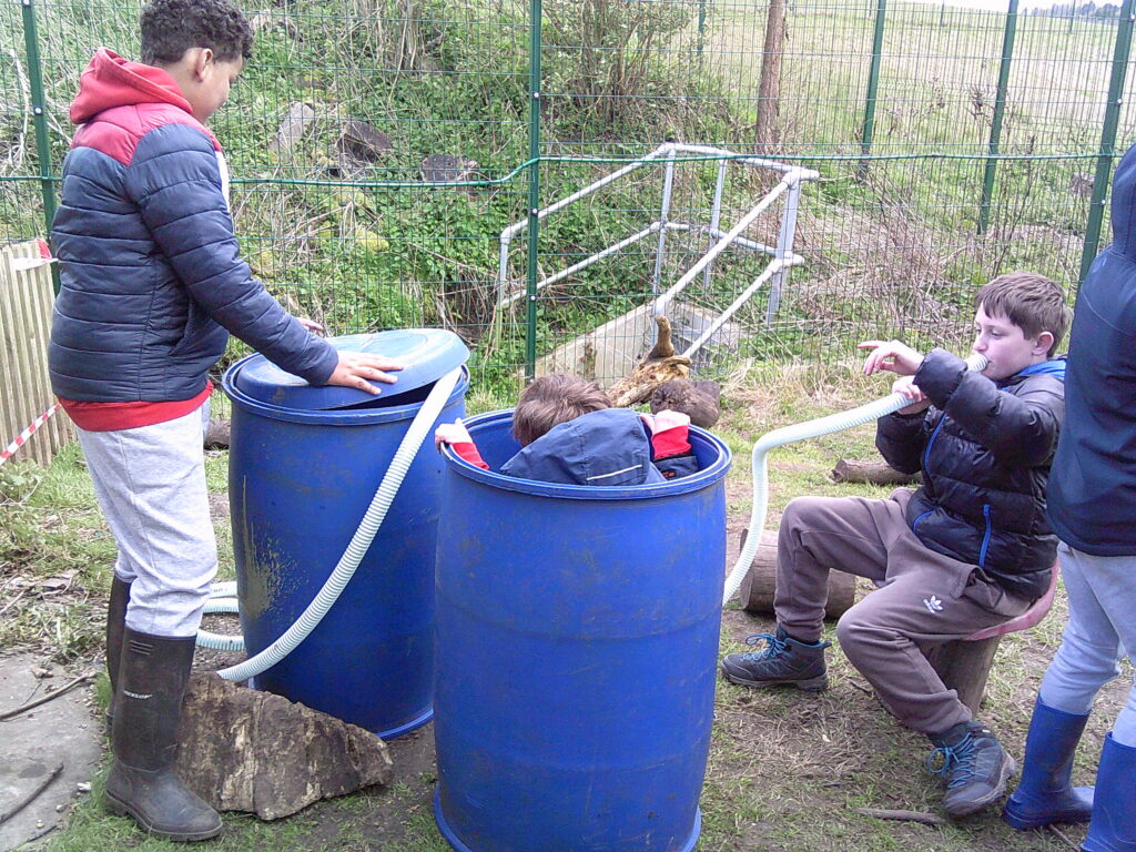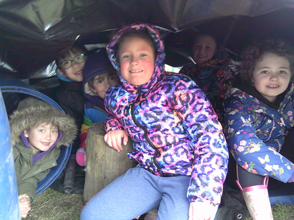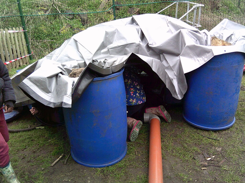The wind was really kicking up this morning and a large group of the Lime class forest experts put the Loose Parts and new giant tarp to GREAT use. They used the barrels as corners and even made a floor using some material and lived like kings for the whole session. They stuck a hoover pipe into one of the barrels and explained that that was how the electricity was provided! Another big group started a game where you had to try and jump and catch hold of the rope swing in the tree, while the digging zone was flooded and churned up in a big way!