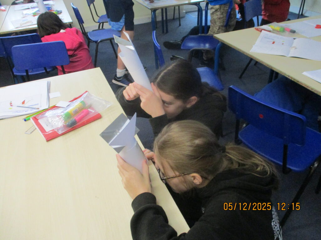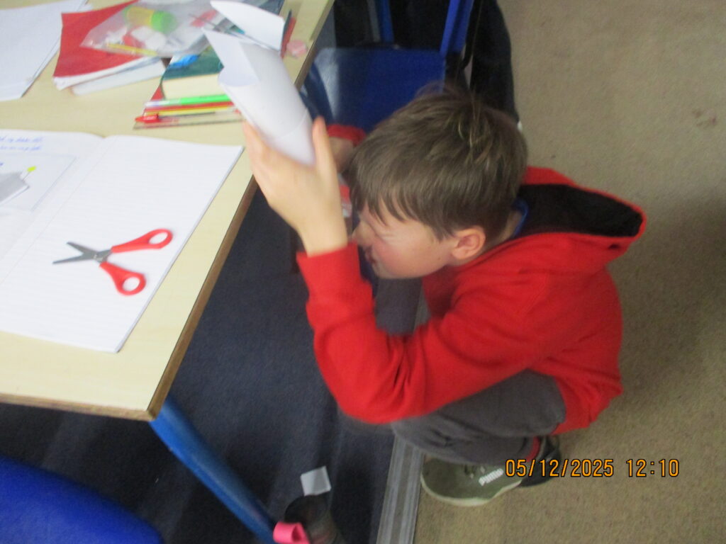 Then, with card, mirrors and a whole lot of curiosity, we got to work making our very own periscopes! Once they were assembled, we had great fun testing them around the classroom (and yes… even doing a little cheeky spying on Maple Class!). We also challenged ourselves to adapt our designs so we could see behind us too—because who doesn’t want to be a secret agent at school?