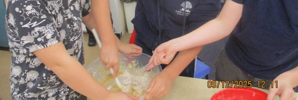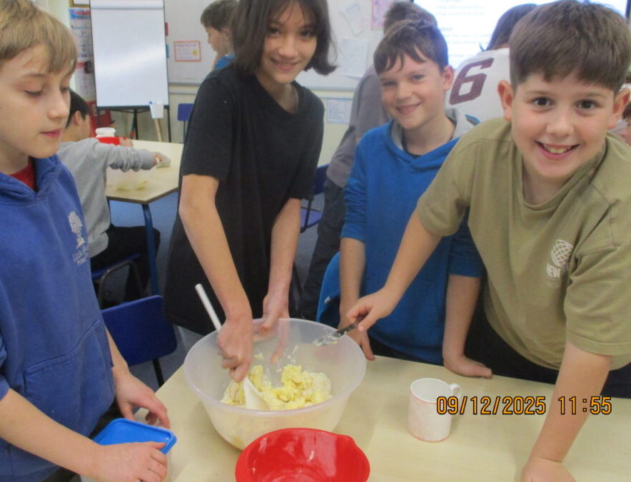 Working in teams, we set out to make the perfect cake batter. We learned to cream butter and sugar until it was light and fluffy, add our eggs a little at a time (to avoid the dreaded curdling!), and fold in the flour gently—very gently—so we didn’t knock out all the precious air. We measured every ingredient with care, carefully checking our units of measure… proudly putting last week’s maths learning to excellent (and delicious) use.