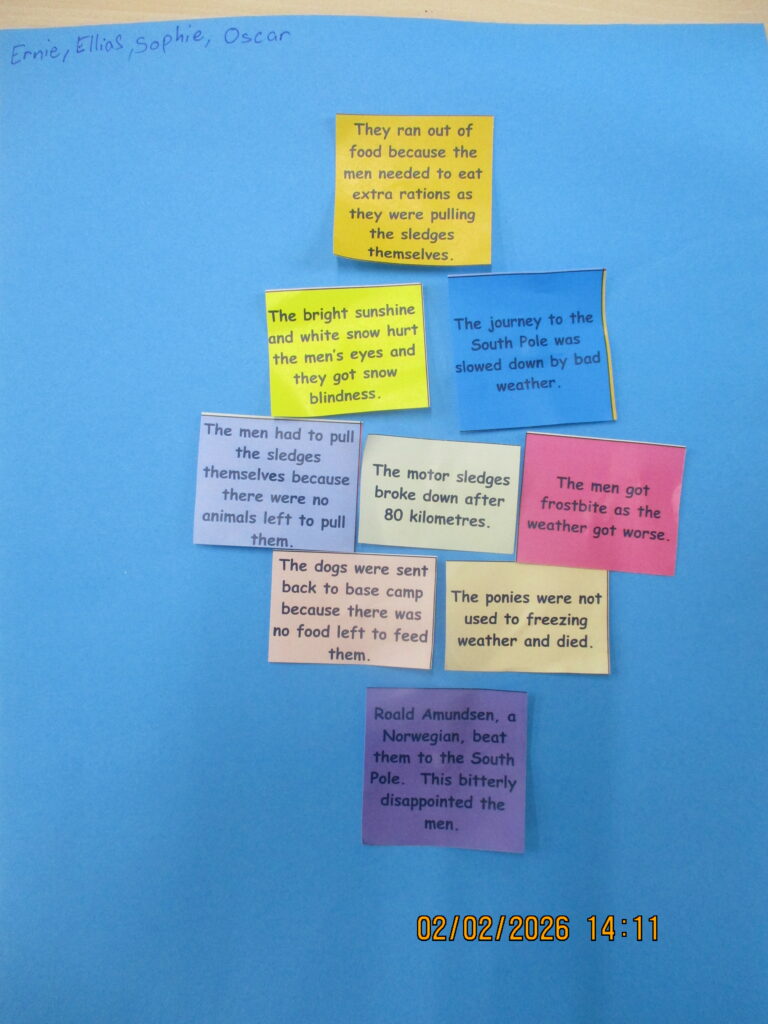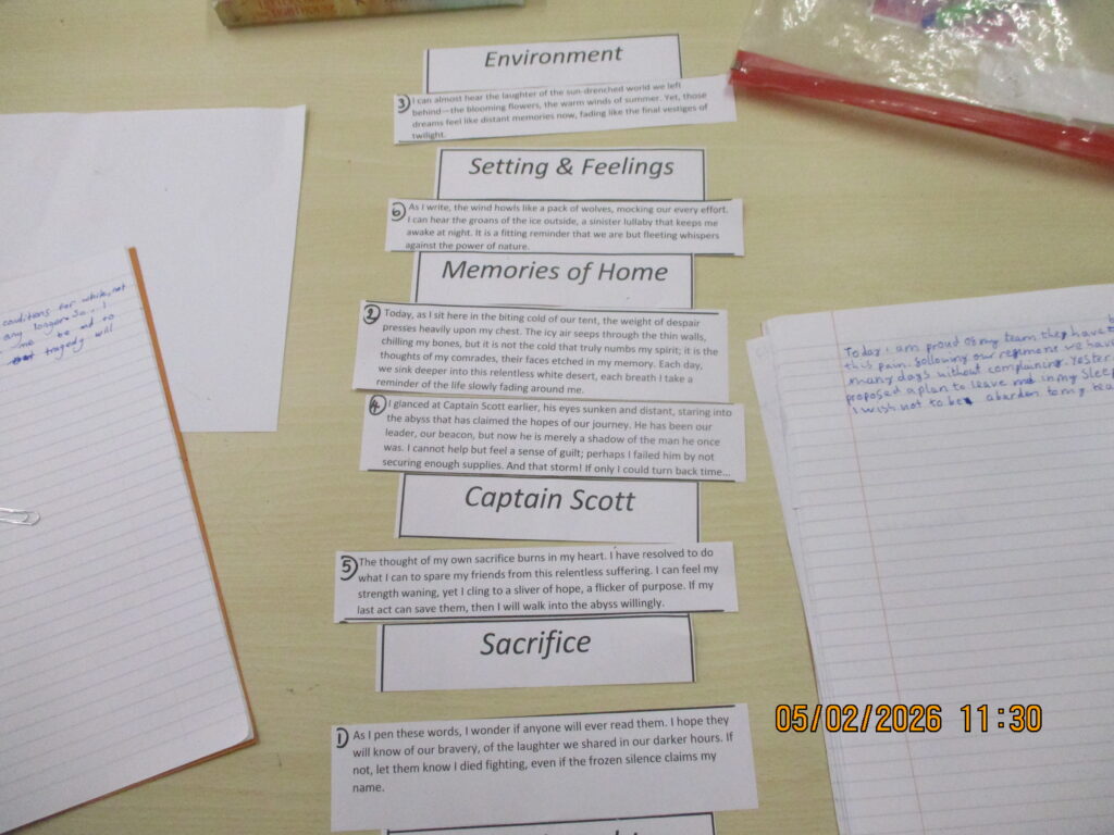 Using extracts from Scott’s journal, we explored Oates’ final moments, aiming to write with authenticity, emotion, and historical accuracy. Before writing our final pieces, we focused on effective paragraphing—including a game that helped us really understand how paragraphs work together to create cohesion. The finished writing has been powerful, moving, and incredibly mature.