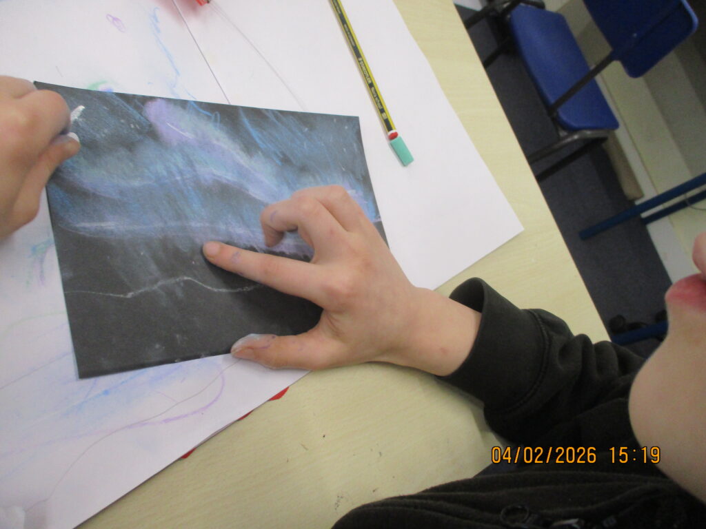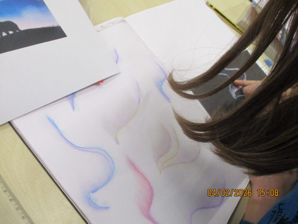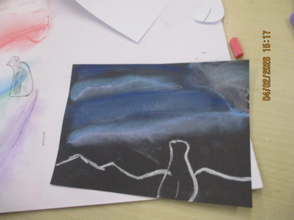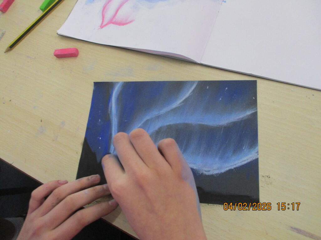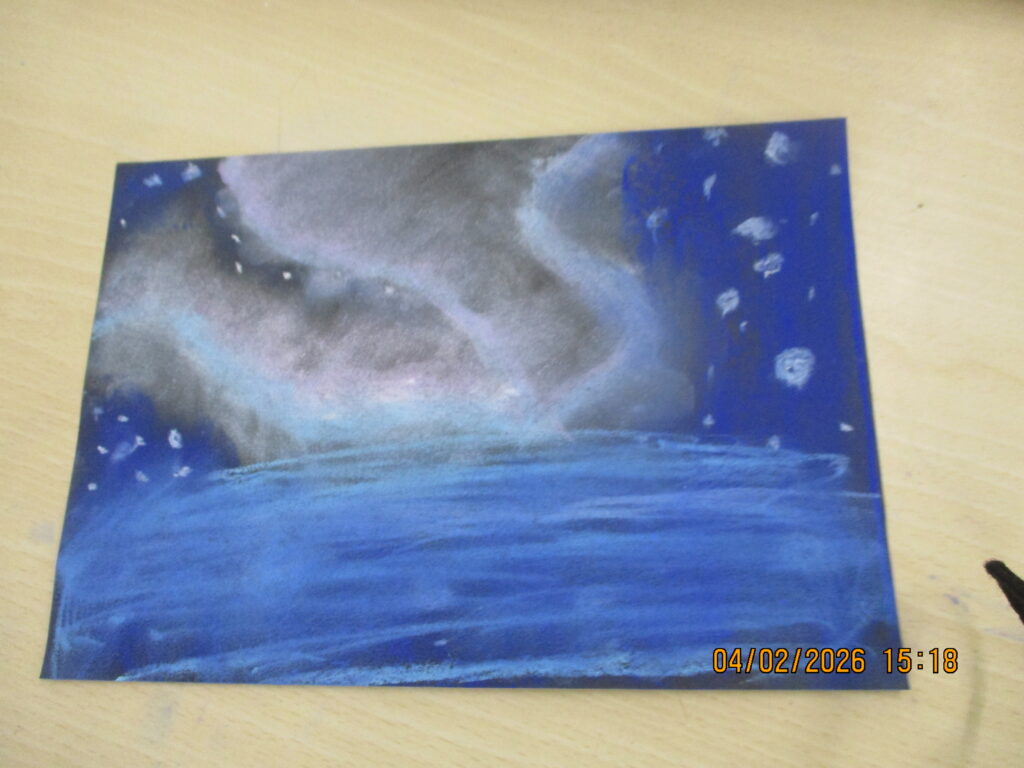 Inspired by the polar regions, we continued experimenting with chalk techniques in Art. The focus? Creating dramatic, swirling Northern Lights scenes.