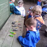 The bugs were at it again with Beech class and the forest was scattered with searching children once more. They helped those that hadn’t found any yet to search and then enjoyed figuring out what each of the toys were. By the end of the session, there was just one green bug not accounted for! Elsewhere, a couple of cafe’s popped up. One made the biggest hot chocolate you’d ever seen and the other had a very gloopy chocolate mixture. A very cool mud sculpture was made too along with a base including real log fire.
