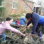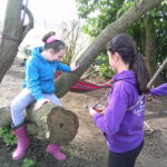 Willow class enjoyed the idea that it was chocolate week and made a chocolate restaurant for Panda’s, in the Loose Parts zone. They used barrel lids as huge plates and found leaf napkins, along with perfect stick cutlery and served some gloopy chocolate mix onto a massive cupboard door table. A band played music through the tubes but it was mainly a loud wailing sound, that didn’t pair well with the food… Elsewhere, someone was pretending to be a ‘Frost Pigeon’ and a bunch of people were training it but after a while it got bored and wanted to climb a tree!