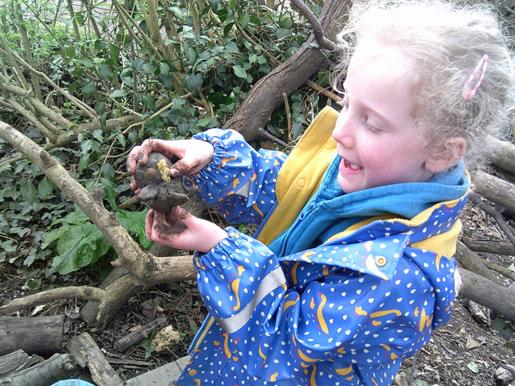 The bugs were at it again with Beech class and the forest was scattered with searching children once more. They helped those that hadn’t found any yet to search and then enjoyed figuring out what each of the toys were. By the end of the session, there was just one green bug not accounted for! Elsewhere, a couple of cafe’s popped up. One made the biggest hot chocolate you’d ever seen and the other had a very gloopy chocolate mixture. A very cool mud sculpture was made too along with a base including real log fire.