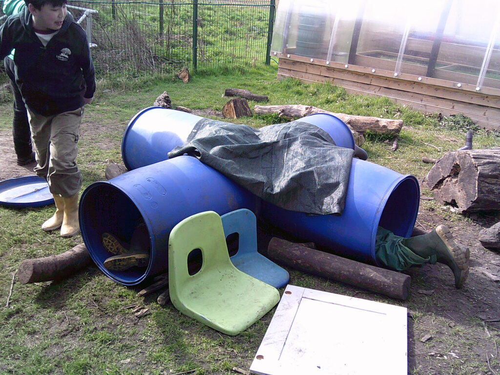 Half of Maple class were at cross country, so the forest felt very spacious! The remaining team definitely made the most of their time and the Loose Parts were especially utilised by a crew making a den. They put the 4 barrels into the centre with a green tarp on top, while a guard stood with a hoover attachment warning whenever anyone approached! A KFC opened (complete with sign) and the chef made the most of the empty forest and used ALL of the buckets for those 11 secret herbs and spices. The Colonel would be proud…