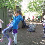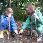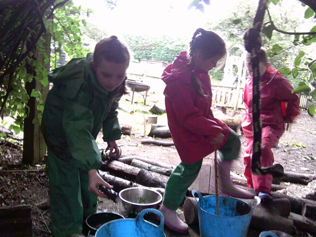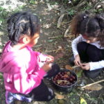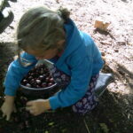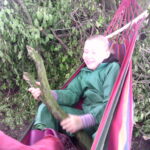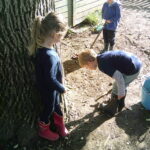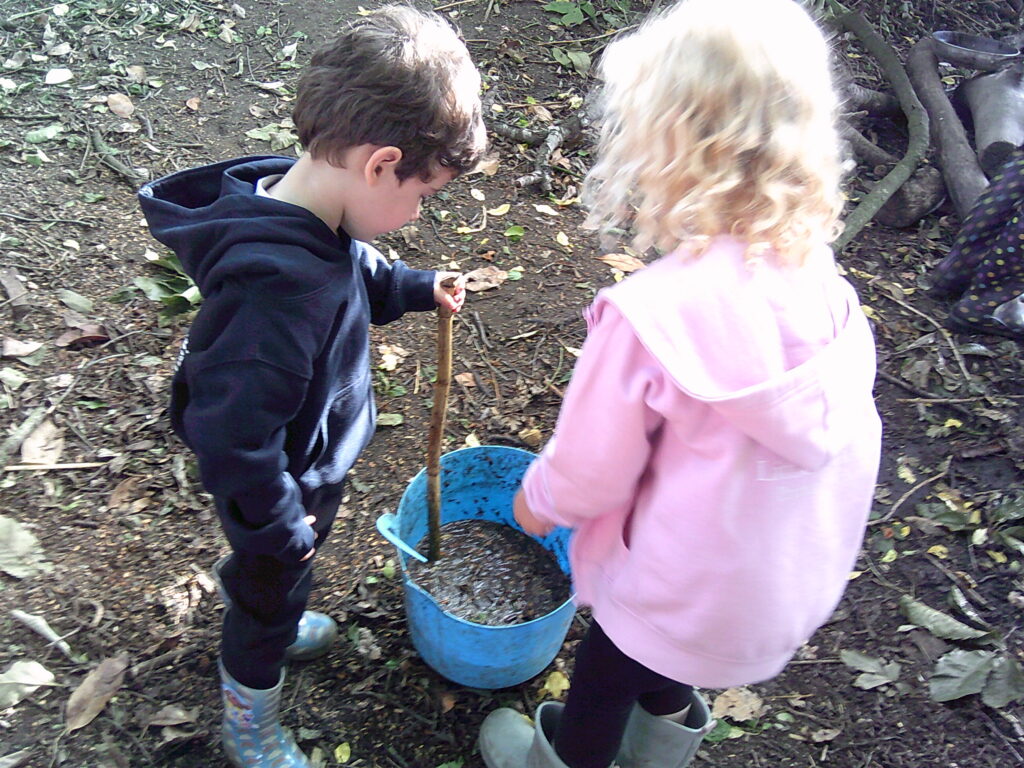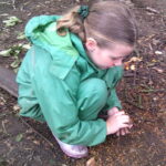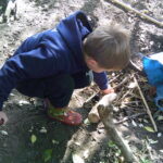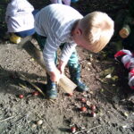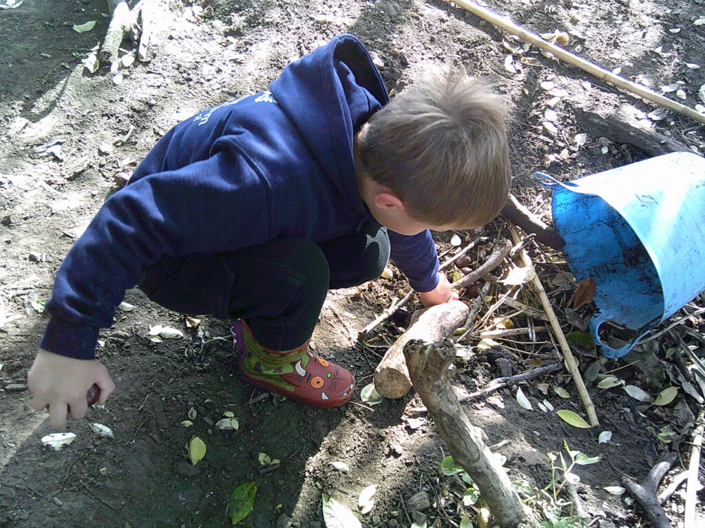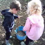 It was a dreary morning and Lime were less than happy with the idea of putting waterproofs on for their 2nd forest back! They soon got over it and made their way outside and discovered the huge array of walnut shells all over the forest. They used them in pots and pans and enjoyed discovering the hard shell underneath the green skin but decided that they shouldn’t open up anymore encase people were allergic. Another highlight was discovering that a stick would go all the way through a hole in the tree!