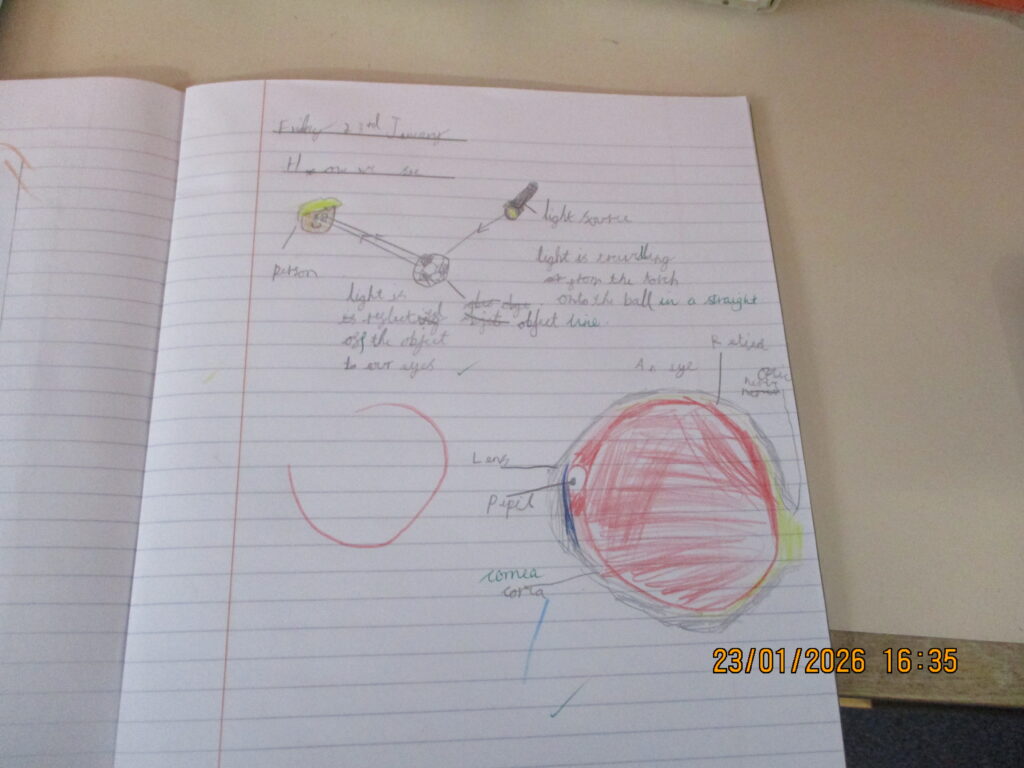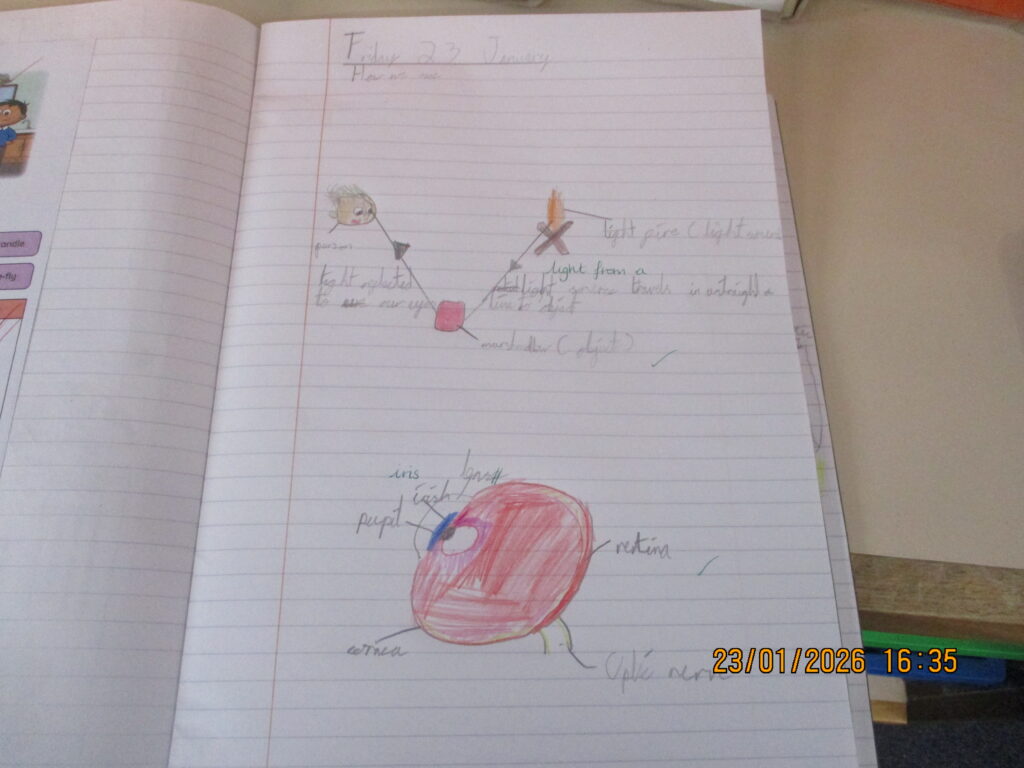 Science learning was split by year group. Year 3 explored how light helps us to see and learned about how our eyes work. Year 4 became “noise patrol,” using a decibel meter around the school to investigate sound levels. They then recorded their findings in bar charts, linking scientific enquiry with data handling skills.