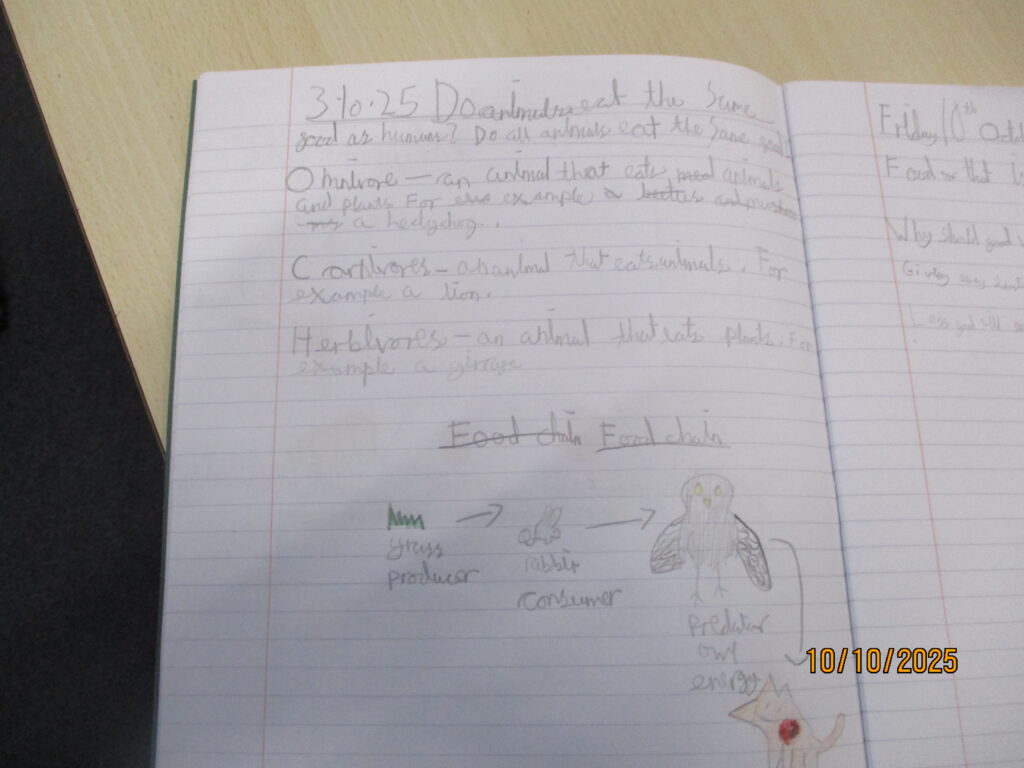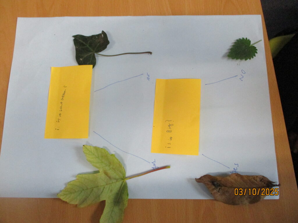 Science learning has been busy and hands-on. Year 3 have been exploring food chains, learning how plants and animals depend on each other and discovering the roles of producers, consumers, and predators. They have also learnt about food waste and sustainability. Meanwhile, Year 4 have been using their sorting and classifying skills to identify and group different types of autumn leaves, noticing patterns in shape, texture, and colour. They have also been outside to collect live data on the number of invertebrates, vertebrates, flowering and non-flowering plants they could find.