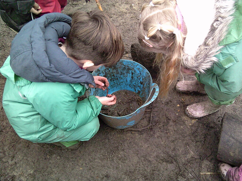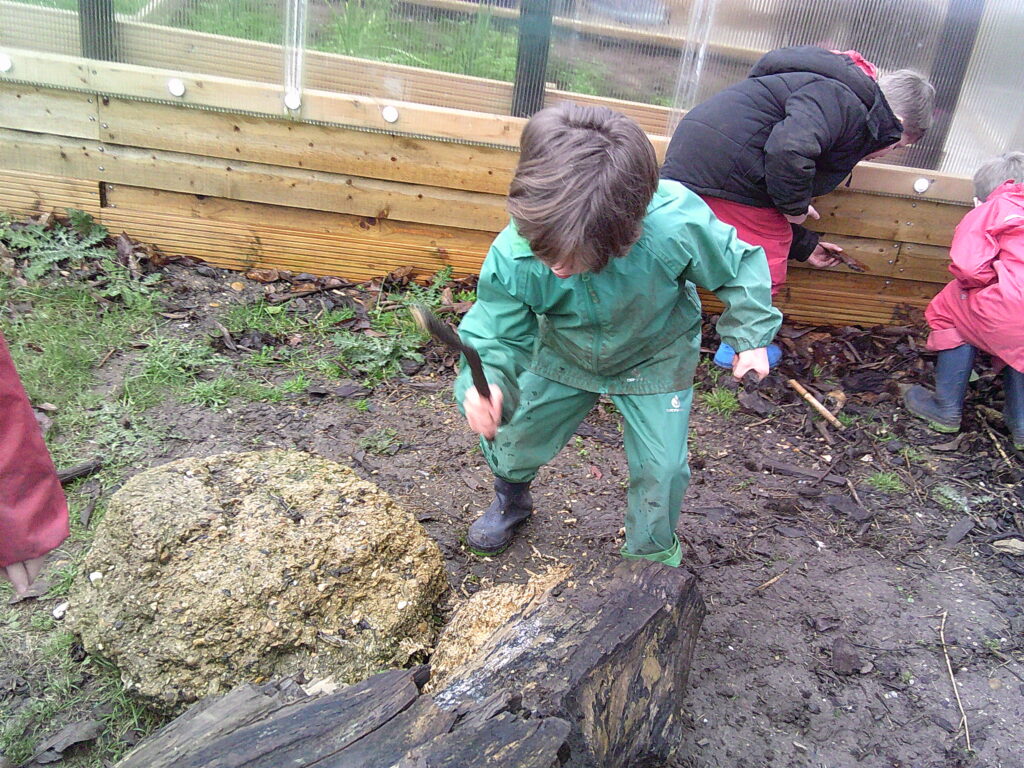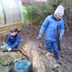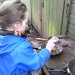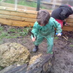 Beech class were also very excited to get mixing and used leaves and sticks as ingredients and toppings on their pancakes. A big group decided that they needed to make a booby trap in the forest, so began collecting lots of sticks and resting them up against some pallets. It was unclear how the trap worked but they were very happy with it by the end of the session. Another team were inspecting the stumps and had filled a huge bucket with heaps of worms and slugs. Finally, a conker was buried in the hopes that a new tree will grow!