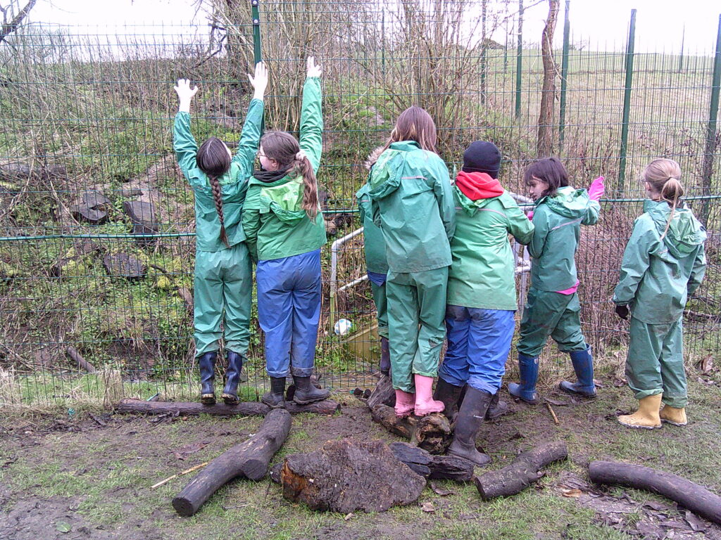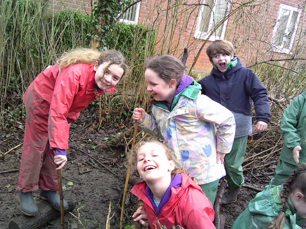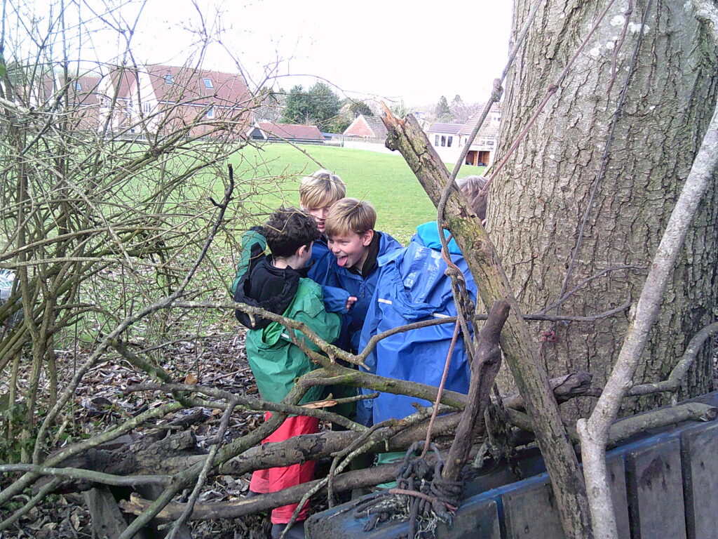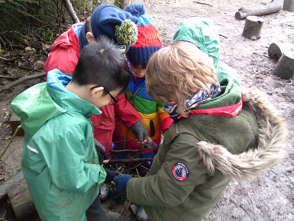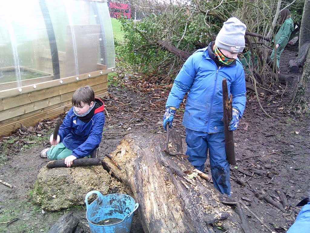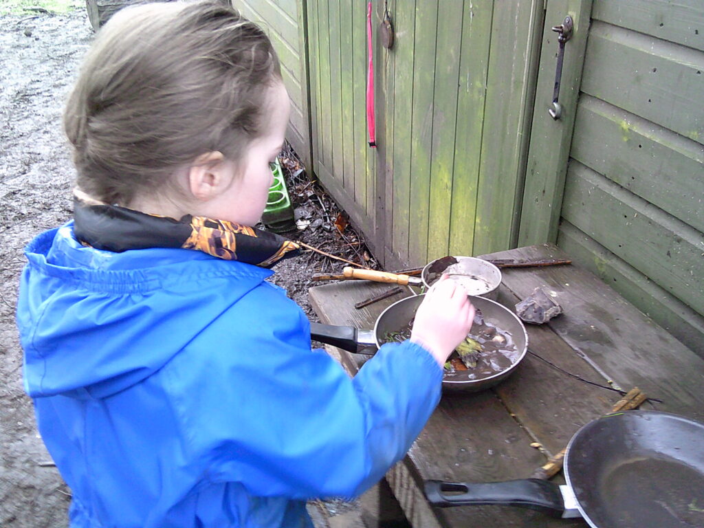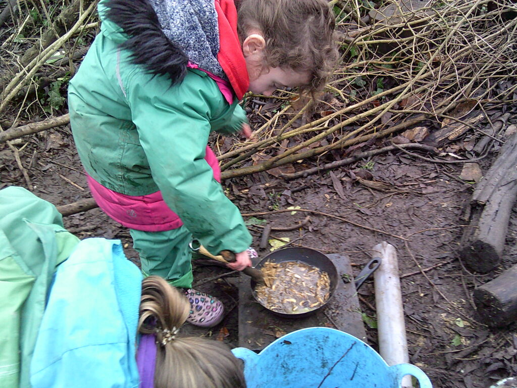 The forest was slightly better than the bog it was on Friday! The Little Hadham children actually made it in today and they made the most of it. Of course CHEESE was once again the word on everyone’s lips. A few teams began chipping away at the soggy wood and logs, to create the hottest commodity in town. They then ferried it around the forest in buckets to whoever needed ingredients. It is also ‘Girl Scout Cookie Day’ this week, so some great cookies were made too. Some old people also toddled around the forest with their walking sticks!