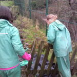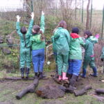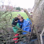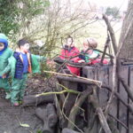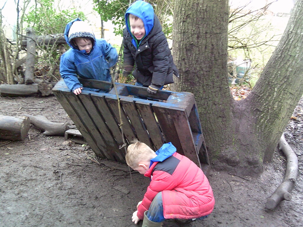 Willow class were hammering away at the logs too and decided that a great battle was to take place between two tribes of magicians. One clan were the Bibbidi-Bobbidi-Boo and the others didn’t seem to have a name but were very protective over their land. Spells were cast across the forest and the greatest battle of all involved lots of rhyming spells such as…’Bibbidi-Bobbidi-Boo, I’ll turn you into a shoe’, ‘Bibbidi-Bobbidi-Boo you look Smurf blue’ which was very funny. Another team worked very hard to tie ropes to a pallet and then hang it up.