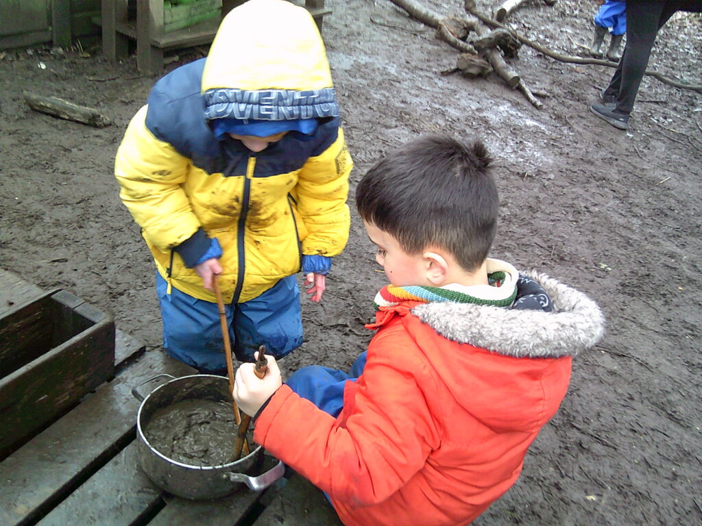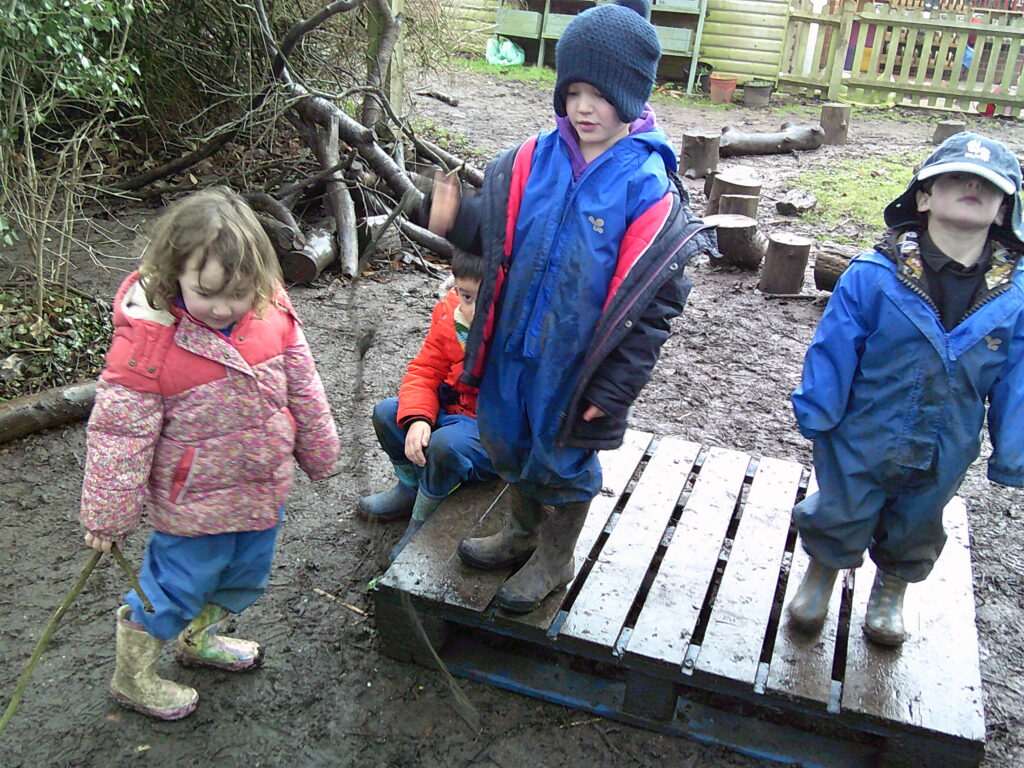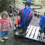 The forest had now been renamed the swamp, although the littlest adventurers weren’t so sure about the new name because there were no alligators in the forest! They made the most of the gloopy floor by making heaps of potions before turning the pallet into a boat and fished off of the side. Anyone not on their boat was considered ‘a man over board’ and they tried fishing them back to dry land! They were tasked with finding some cool stones and through the mud, a pile of rocks was collected. They were very muddy by the end!
